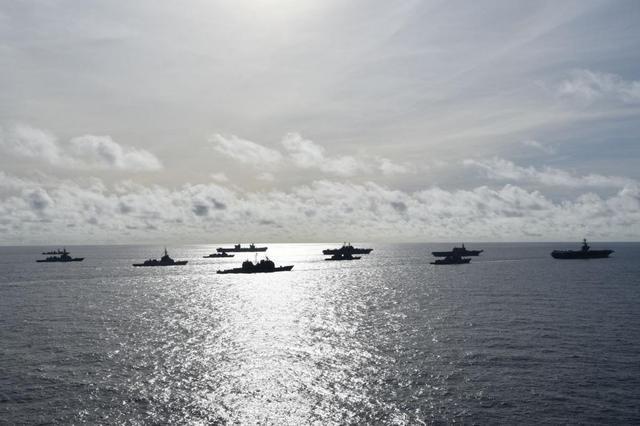 【日媒炒作凉月号一事之际,美英日澳等国在菲律宾海进行“多-大甲板”演练摆拍】